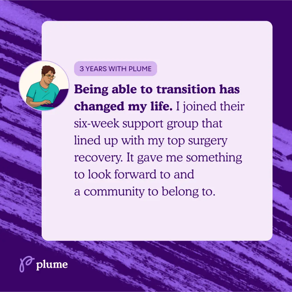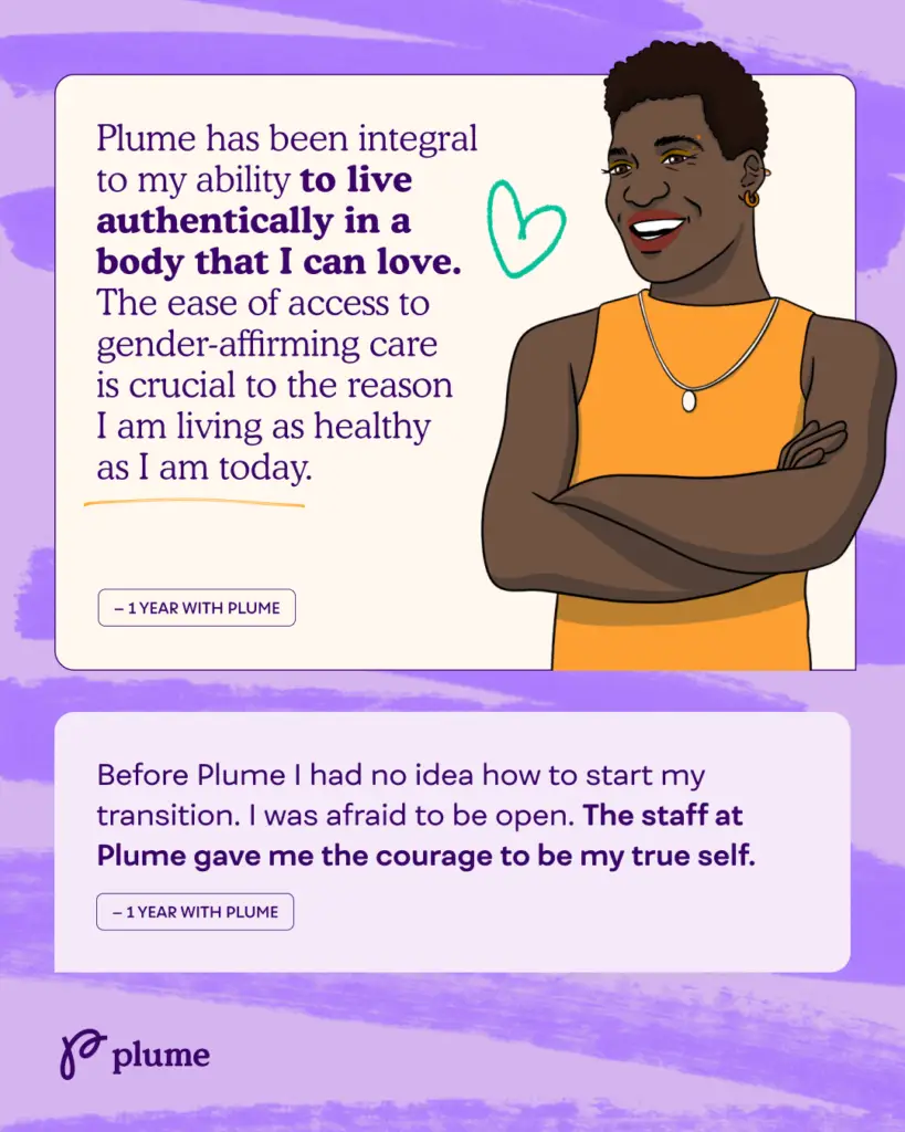 The plume is not just a symbol for our organization; it represents the power to author your own narrative. In a world where trans people often face barriers, discrimination, and gatekeeping, Plume stands out as care that is accessible and helps support trans, non-binary, and gender non-conforming people of all backgrounds to take control of their gender journey. We are honored to be a part of so many stories where trans people have found the strength to take control of their identities, pursue their dreams, and live their truths.