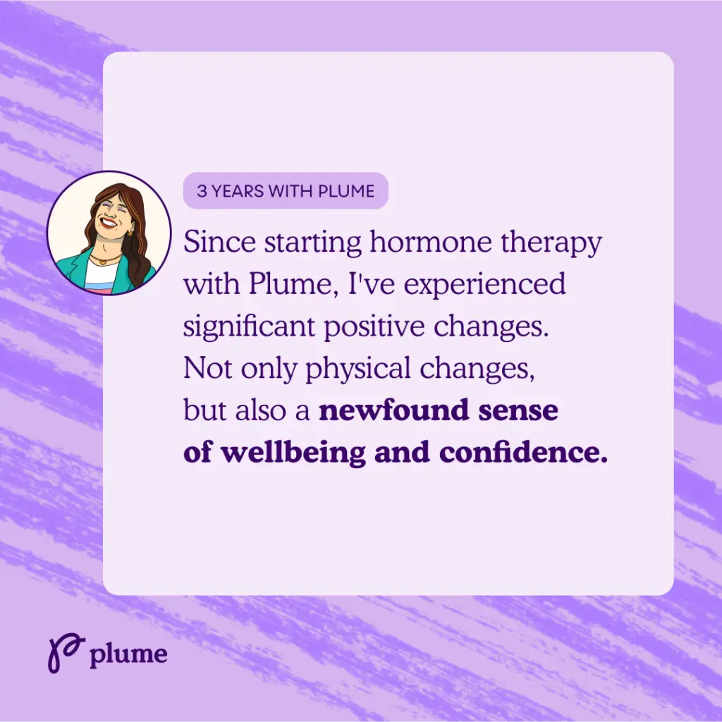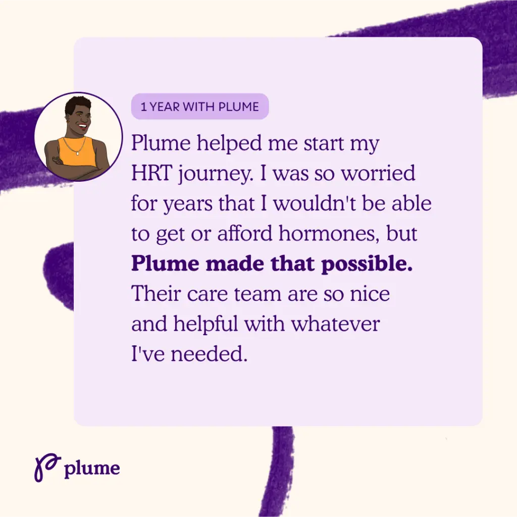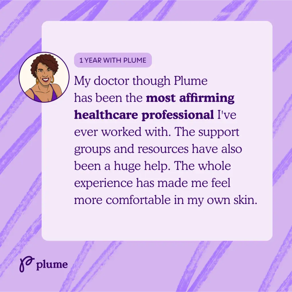 As we approach our five-year anniversary, we are reflecting on the journey we’ve taken together with the thousands of trans and non-binary people who have entrusted us with their care. Our role has been to provide the tools, support, and care needed to help our patients live authentically and fully. We asked, “How has Plume supported you on your gender journey?” Here are their stories in their own words: