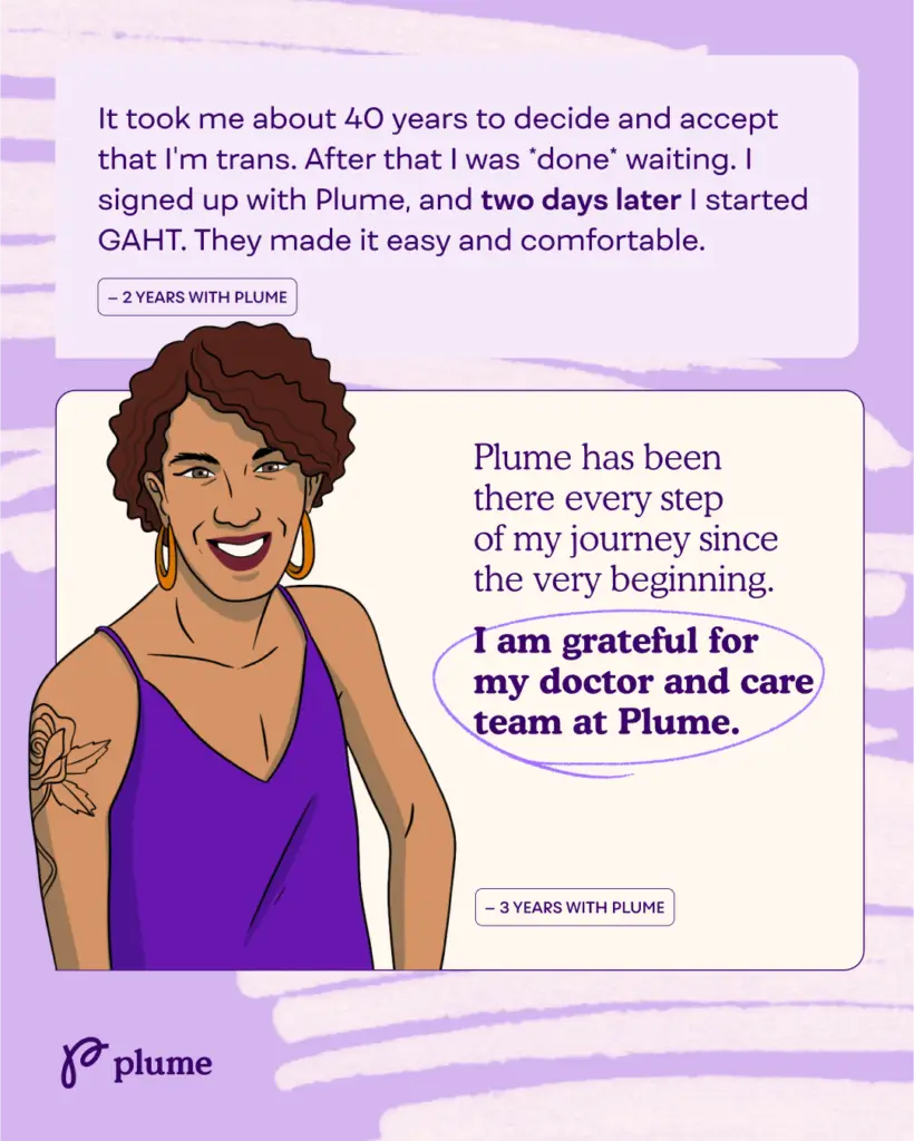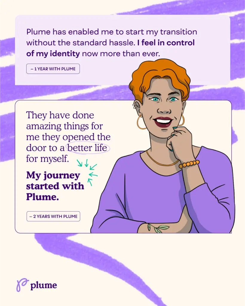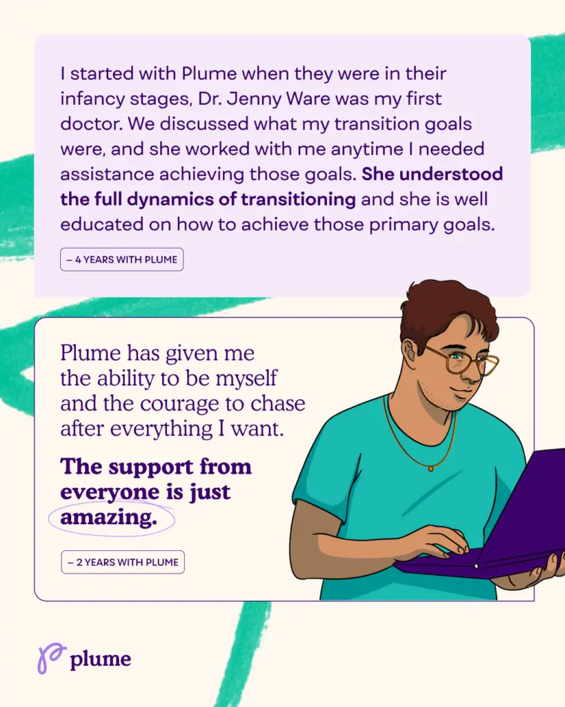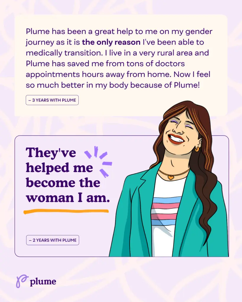 Plume is turning 5! Since our founding, our mission has been to get trans people the right care at the right time in a relatable and reliable way. At Plume, we understand that being trans is about more than just a medical transition; it’s about writing your own story. Each individual’s journey is unique, filled with personal challenges, triumphs, and milestones. Over these five years, we’ve been humbled by the stories of courage and transformation that our patients have shared with us.